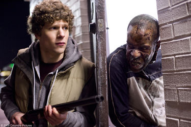 Zombieland is definitely more comedy than horror. It’s not even scary, unless you count the occasional cheap shock (industry term for when something jumps out at you). I laughed pretty hard, though. It’s hard to believe a movie that goes through so many drums of corn syrup could be this lighthearted. The main part of the action kicks off in Garland, Texas (“it might look like zombies destroyed it, but that’s just Garland”), where we meet our narrator (Jesse Eisenberg), who identifies himself only as “Columbus,” the city he’s from. He explains his rules for surviving Z-land, which are superimposed on the screen as amusing graphics. He then has a chance to demonstrate them in an encounter with three zombies (below).